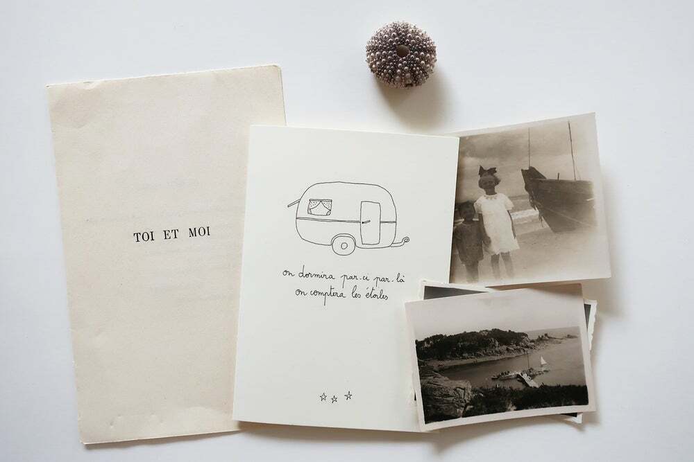 "On dormira par-ci par-là On comptera les étoiles." と書かれたポストカード。